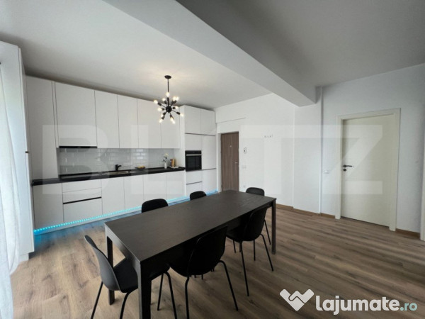 BLITZ va propune spre inchiriere, apartament 3 camere, semidecomandat, situat într-un ansamblu rezidențial nou, cu bloc dotat cu lift. Apartamentul este complet mobilat și utilat, incluzând aer condiționat și o baie generoasă cu cadă. Bucătăria este deschisă către sufragerie, oferind un spațiu modern și amplu, ideal pentru relaxare și petrecerea timpului liber.