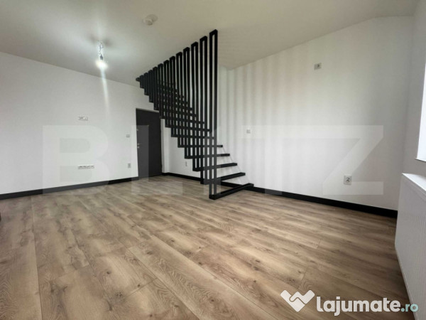 Apartamentul dispus pe doua nivele, este complet decomandat iar spatiul este bine optimizat dupa cum urmeaza: bucatarie cu living open space, 1 dormitor, 1 baie si 1 hol situate la nivelul inferior iar la nivelul superior, apartamentul este compus din 2 dormitoare si o baie.