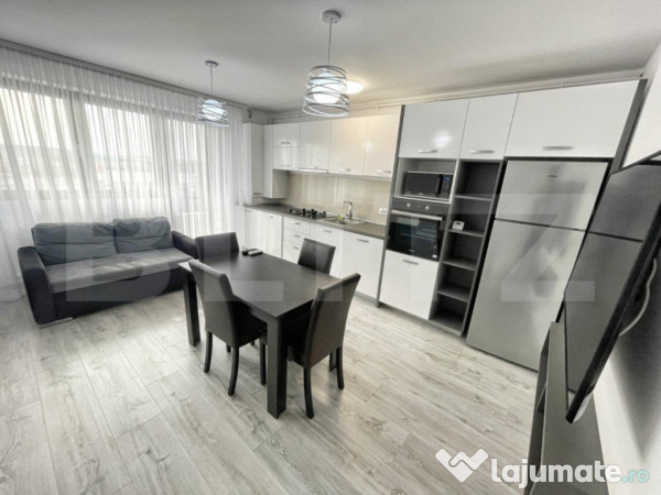 Dispune de finisaje de calitate, dar si de alte facilitati precum: centrala proprie, aer conditionat, masina de spalat vase/rufe, cuptor electric, plita pe gaz, frigider, parcare privata!