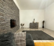 Living elegant cu perete decorativ din piatră naturală și șemineu electric