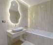 Bucataria este integrata, cu mobilier realizat pe comanda, fronturi mate si electrocasnice incorporate. Totul arata curat, nou si bine gandit, fara spatiu pierdut.