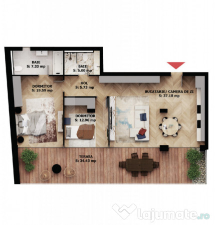 Cele două dormitoare asigură intimitate și relaxare, fiind completate de băi finisate la standarde premium. Terasa de mari dimensiuni este elementul central al apartamentului – un spațiu rar, ideal pentru relaxare, socializare sau momente petrecute în aer liber, cu o panoramă urbană deschisă.