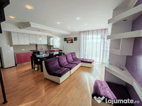 Locuința se află la etajul 2, se desfășoară pe două niveluri și are o suprafață utilă de 111 mp, la care se adaugă două terase generoase de câte 12 mp fiecare. Apartamentul este mobilat parțial, dispune de scară interioară și două locuri de parcare incluse în preț.