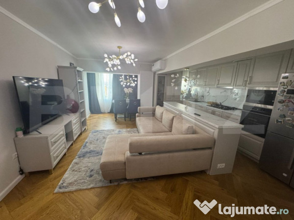 Locuința a fost renovată integral, incluzând schimbarea instalațiilor sanitare și electrice, și beneficiază de finisaje și materiale premium. Este dotată cu centrală termică proprie, aer condiționat și geamuri termopan de înaltă calitate, toate rabatabile și securizate.