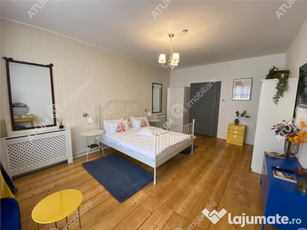Apartamentul beneficiaza de usa metalica la intrare, usi de lemn la interior, tamplarie din lemn, centrala termica proprie cu calorifere din otel, gresie, faianta, pardoseala din lemn masiv dar si soba de teracota care este folosita ca si scop decorativ. El se inchiriaza in regim hotelier aducand un profit substantial avand un scor de 9.6 pe booking, viitorul proprietar poate cumpara aceasta proprietate ca si un business la cheie. Pozitionarea imobilului este la 5 minute de mers pe jos de Podul Minciunilor, Piata Mica si Piata Mare unde sunt restaurante, cafenele si atractiile turistice ale Sibiului.