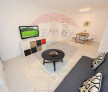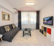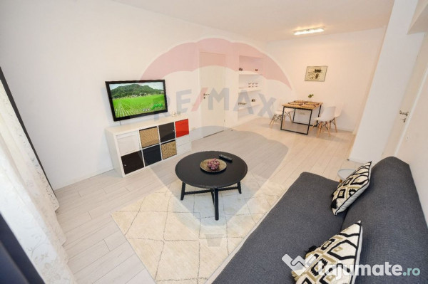 • Living modern, amenajat cu gust: canapea confortabilă, TV, masă de cafea, zonă de dining și spații de depozitare
