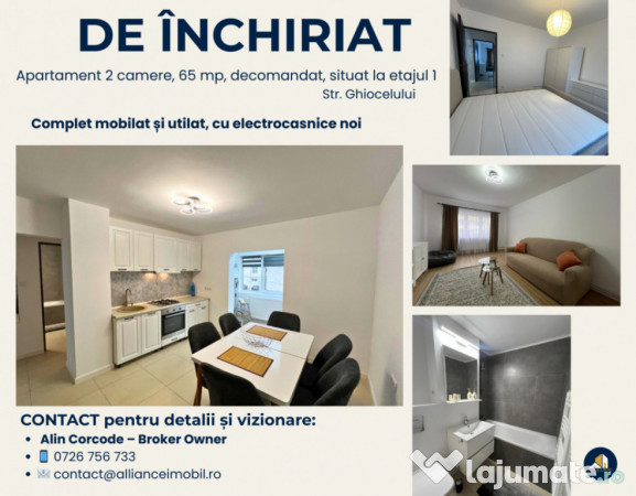 Se închiriază apartament 2 camere, 65 mp, decomandat, situat la etajul 1 al unui imobil bine întreținut, pe Strada Ghiocelului, într-o zonă centrală, cu acces rapid la mijloace de transport, magazine și puncte de interes.