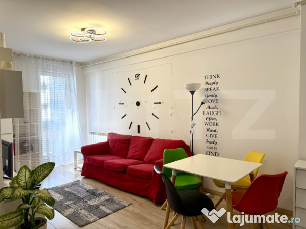 Compartimentarea apartamentului este semidecomandata, gandita astfel: living cu bucatarie, dormitor, hol, baie. Beneficiaza de centrala termica proprie, geamuri termopan cu tamplarie din PVC si usa metalica la intrare.