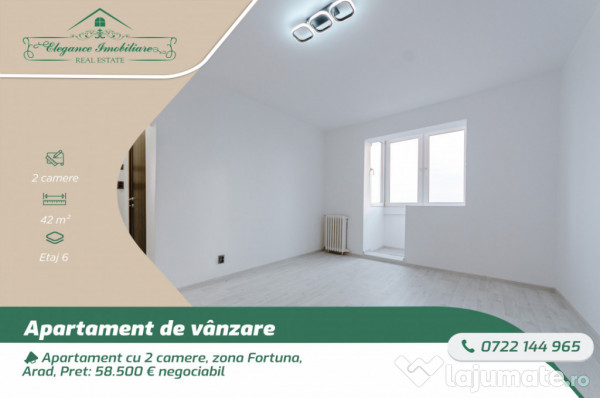 Elegance Imobiliare vă propune spre achiziție un apartament cochet și modern, situat în zona Fortuna din Arad, la etajul 6 al unui imobil cu 10 niveluri. Cu o suprafață construită de 42 mp și o compartimentare semidecomandată, această locuință recent renovată în 2025 oferă un ambient plăcut și funcțional.