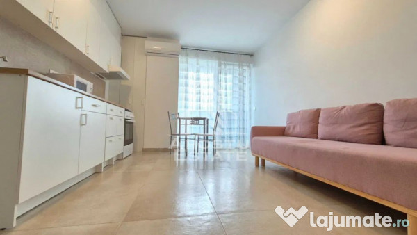 -Living room luminos cu bucatarie open-space.