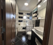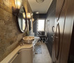 Baia matrimoniala este placata cu piatra naturala si travertin, iar mobilierul este realizat din MDF vopsit.