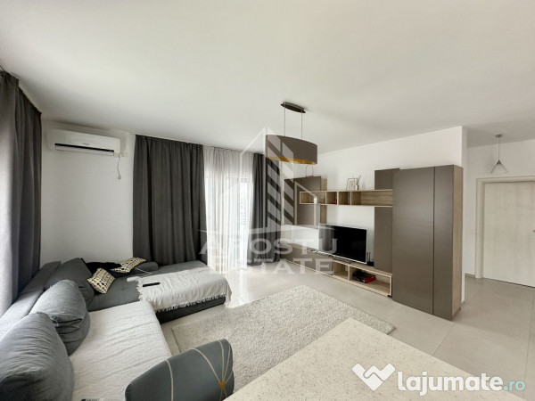 Living luminos, open-space, cu bucatarie complet mobilata si utilata, cu zona de dining si iesire pe terasa deschisa