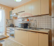 Bucătăria este complet mobilată și utilată și dispune, de asemenea, de acces către terasă. Terasa generoasă îți oferă posibilitatea de a-ți amenaja un colț de relaxare sau chiar un grătar, existând deja suport pentru prelată.