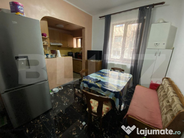 Apartament cu 4 camere, 2 bai, bucatarie, un pod, curte comuna, un singur vecin si pacare proprie. Suprafata totala 114, avand si teren..