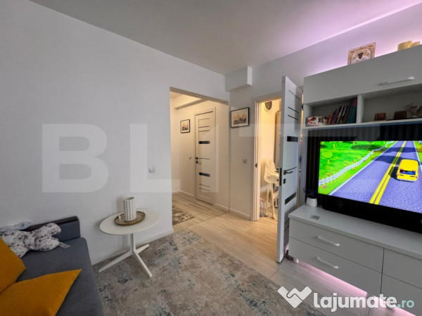 Apartamentul a fost renovat complet de la placa, s-au refacut toate instalatiile, s-a schimbat gresia si parchetul, centrala termica, s-a montat aparat de AC, s-au schimbat geamurile, usile din apartament si usa de la intrare.