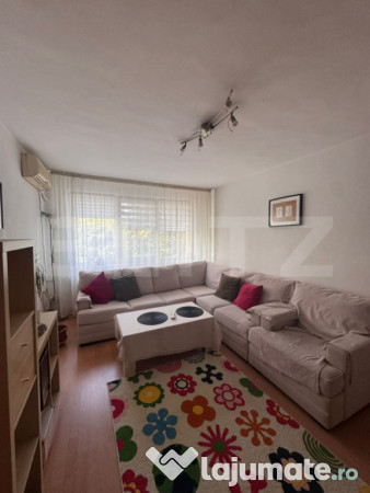 Apartamentul dispune de un living încăpător, complet mobilat și dotat cu aer condiționat, un dormitor prevăzut cu zonă de birou și balcon, precum și un dormitor matrimonial cu mult spațiu de depozitare și balcon închis. Bucătăria este mobilată și utilată complet, iar baia este dotată și funcțională, pregătită pentru utilizare imediată.