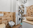 Baie renovată, dotată cu cadă, mașină de spălat și finisaje moderne în tonuri naturale.