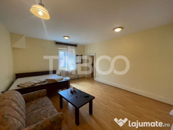 TABOO Imobiliare propune un apartament de inchiriat cu 4 camere, decomandat, situat in localitatea Sibiu, zona Centrul Istoric, aflat la etajul 1 intr -un imobil tip casa/vila cu regim de inaltime pe Parter + 1 Etaje; anul constructiei 1930, structura caramida. Suprafata utila de 125 mp + terasa de 15 mp.