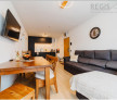 Livingul este spatios si luminos, dotat cu o canapea confortabila, o masa de cafea si un televizor cu ecran plat. Vitrajele mari ofera o panorama minunata asupra peisajului montan.