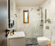 Două băi – una dotată cu duș și cealaltă cu cadă, ambele având finisaje premium și facilități esențiale precum uscător de păr, fier și masă de călcat, papuci de casă și articole de igienă.