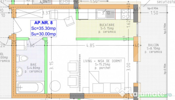 Terasă: 8,10 mp suprafata, pardosea din ceramica