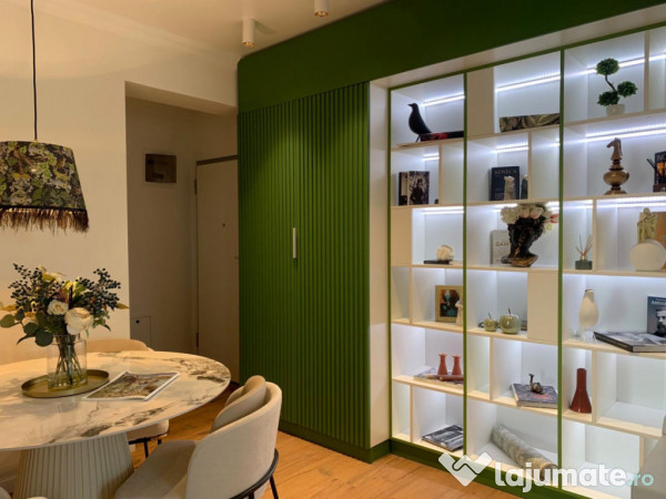 Îți propun un apartament de 45 mp utili cu terasă de 20 mp, într-un bloc nou din 2023. Te întâmpină un design atent lucrat, mobilier premium și o atmosferă cosy care te prinde imediat. Lumina caldă, accentele verzi și detaliile elegante creează un spațiu în care te simți bine din prima clipă.