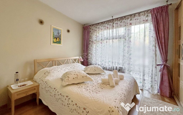 - Doua dormitoare mobilate, ambele detin baie proprie si acces la terasa comuna, beneficiaza de vedere panoramica catre munti;