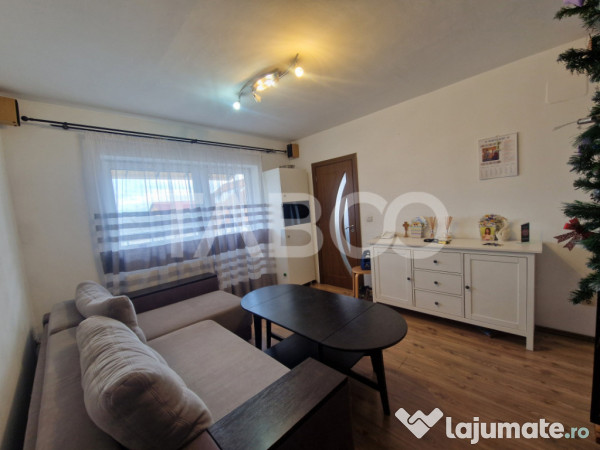 Distribuit pe doua niveluri, cu nisa separata pentru gatit, cu iesire pe balcon din camera de zi si cu scari din lemn de fag ce duc catre camerele de la etaj, acest apartament are o disponibilitate imediata si mutarea se poate face imediat, fiind intru totul functional.