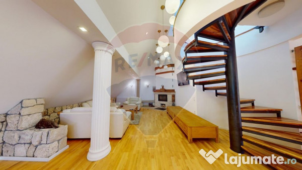 La primul nivel (131 mp utili): Living generos cu șemineu, loc de luat masa cu balcon, 2 dormitoare fiecare cu baie proprie, dressing și terasă închisă + deschisă, bucătărie modernă, hol și scări.