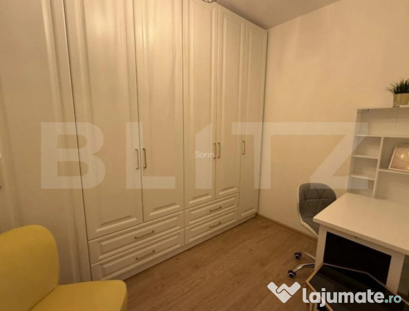 **Blitz ** vă oferă spre vânzare un apartament de lux, complet mobilat și utilat, situat la etajul 3 într-un complex modern. Designul contemporan și finisajele premium oferă un living spațios cu bucătărie open space, dormitor matrimonial, birou, baie și două balcoane generoase. Printre facilități se numără garaj subteran, parcare supraterană și boxă la subsol.
