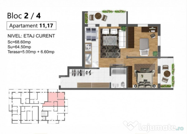 Apartamentul este disponibil la parter și la etajele curente, având o suprafață utilă de 64.50 mp. Acesta beneficiază de două terase, cu un total de 11.60 mp de spațiu exterior.