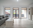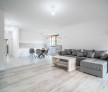 Parchet laminat de 12 mm și gresie/faianta de calitate superioară, cu plăci ceramice de 1.2 m, oferind un aspect modern și elegant