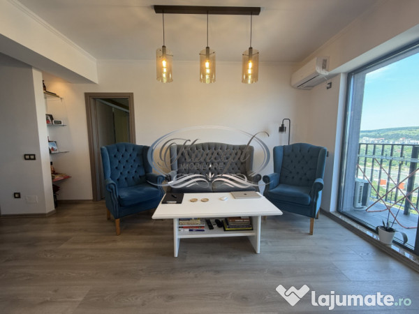 Koncept Imobiliare va propune spre inchiriere un apartament cu 2 camere, situat in zona Calea Floresti din cartierul Manastur, in imediata apropiere a Pietei Flora. Apartamentul este amplasat la etajul 13 din 25 al celui mai inalt bloc rezidential din Romania, oferind o priveliste spectaculoasa si acces facil catre punctele de interes ale orasului. Cu o suprafata utila de 50 mp, apartamentul este compartimentat eficient si include 2 camere, bucatarie, baie, hol si un balcon de 5 mp, perfect pentru momente de relaxare la inaltime. Nu permite recompartimentari, dar structura actuala asigura functionalitate si confort. Se ofera complet mobilat si beneficiaza de loc de parcare suprateran inclus. Finisajele sunt moderne, iar incalzirea se realizeaza prin pardoseala, alimentata de centrala proprie a imobilului. Orientarea nordica pastreaza o temperatura constanta si echilibrata, indiferent de sezon. Cladirea este echipata cu lift panoramic, accentuand experienta urbana premium. Recomandat pentru o persoana activa sau un cuplu care cauta o locuinta moderna, bine conectata si cu un plus de exclusivitate. Pentru informatii complete, programarea unei vizionari sau pentru a afla oferta noastra completa va stam la dispozitie telefonic, prin e-mail sau la sediul agentiei noastre, pe str. Aviator Badescu, nr. 19, Cluj-Napoca.