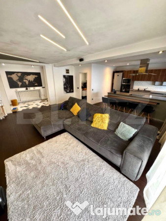Livingul este gândit ca un spațiu generos și versatil, care îmbină perfect confortul zilnic cu eleganța momentelor de socializare. Parchetul de calitate și luminile ambientale creează o atmosferă caldă și primitoare, iar zona de bar și masa de dining, oferă flexibilitate în organizarea spațiului. Bucătăria deschisă dispune de o suprafață amplă pentru gătit, ideală atât pentru mesele de zi cu zi, cât și pentru momente speciale alături de familie și prieteni. Atât din living, cât și de pe balcon, priveliștea asupra orașului adaugă un farmec aparte și completează perfect experiența acestui spațiu.