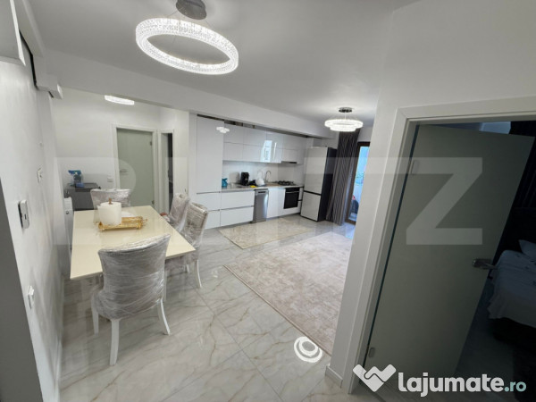 Vă propunem spre vânzare un apartament elegant cu 3 camere, cu o suprafață de 58 mp, situat într-o zonă liniștită și verde, ideală pentru cupluri sau familii tinere. Proprietatea beneficiază de **finisaje de lux**, oferind un ambient modern și confortabil, perfect pentru un stil de viață activ și relaxat. Apartamentul se vinde mobilat și utilat exact ca în prezentare