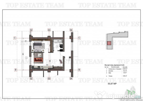 Suprafata utila a apartamentului este de 41 mp, suprafata totala este 50.84 mp, confort: 1.