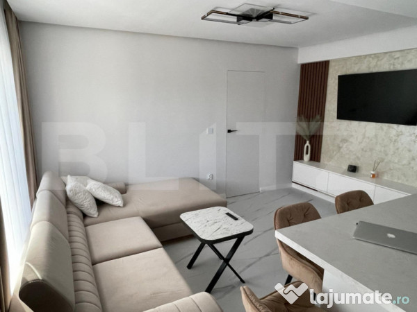 Cu o suprafață utilă de 55 mp și o terasă spațioasă de 13 mp, apartamentul este compartimentat inteligent și se remarcă printr-o atenție excepțională la detalii: tâmplărie PVC cu geam tripan pentru izolare termică și fonică excelentă, pardoseală SPC de ultimă generație, uși interioare cu toc ascuns, tavan coborât cu iluminare ambientală integrată, mobilier realizat la comandă și multiple spații de depozitare perfect integrate în design. Compartimentarea este moderna, apartamentul fiind compus din 2 camere, living cu bucatarie open space, hol spatios si baie cu geam pentru ventilatie naturala.
