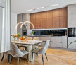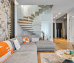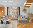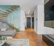 Zona de zi impresionează printr-un living spectaculos, cu accente decorative de design și o scară suspendată din sticlă structurală și trepte din lemn masiv – element iconic al casei. Din living ai acces direct către bucătăria open-space, complet echipată și mobilată cu piese de design, precum și către zona de dining, perfect integrată în fluxul locuinței.