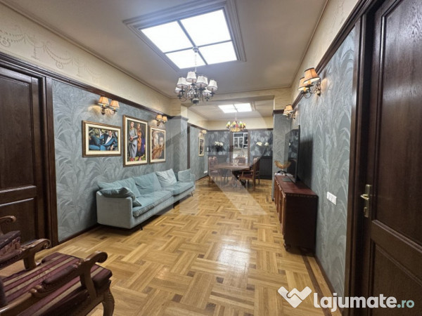 Apartamentul cu suprafata de 190 mp, tavanului inalt de 3 m, are 6 camere, 2 camere tip dressing, bucataria cu camara si centrala termica, 3 bai cu fereastra, iar balconul transformat intr-o camera-seif.