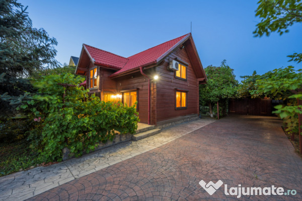 Situata pe soseaua centrala, acces imediat din autostrada A2. Locuinta curata si confortabila, constructie solida din lemn, perfecta pentru casa de vacanta sau rezidenta, ideala pentru cei care isi doresc liniste si spatii de recreere pentru copii. Lot de 2000 mp, doua fronturi stradale, amenajat peisagistic, vegetatie matura, garaj mare, foisor. Interior luminos si ergonomic, doua dormitoare, living generos, doua bai, stare buna, toate utilitatile.