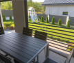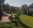 Toata curte este amenajata ireprosabil: alei si trotuare betonate si pavate, gazon impecabil, intretinut cu sistem de irigare automatizat, plante decorative, brazi argintii, tuia.