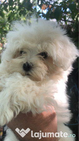 Pui bichon maltez alb de talie mica rasa pura in varsta de 8 saptamani provine din parinti de rasa pura are deparazitare facuta si primul vaccin la maturitate va avea 2.5 kg - 3 kg