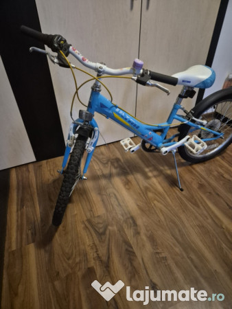 Vând bicicleta pentru copii Larisa Ultra Junior 20″, culoare albastru marin, în stare excelentă, folosită foarte puțin. Ideală pentru copii de 6–10 ani. Dotări: cric si sonerie, cadru oțel, frâne V‑Brake + frână torpedo, fără defecte.
