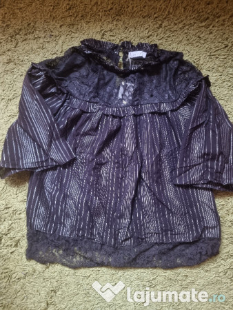 Bluză drăguță, de ocazie, cu detalii din dantela si insertie de fir lame, stralucitor. Cu mâneci trei sferturi, largi.