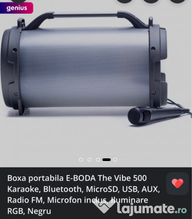 Bluetooth, USB, Cititor de carduri, Aux, Tuner radio, Microfon, Putre 18W, Autonomie 2,5 ore, Fecventa 100-200000 Hz, Impedanta 4 ohm, Greutate 1kg.