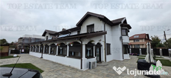 Va propunem spre vanzare o vila exclusivista de 425mp cu terasa acoperita de 80m si compusa din 10 camere care sunt formate din 2 livinguri cu spatii de dinning, 6 dormitoare la etaj, 2 camere amenajate ca birouri la parter, precum si 2 bucatarii complet utilate si separate, 1 spalatorie/uscatorie de 26.5mp si o curte proprie de 970mp.