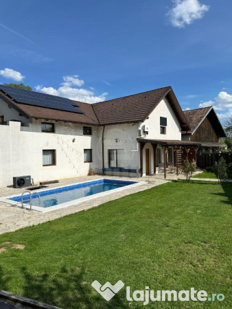 Imobilul dispune de 21 de locuri de cazare și este compartimentat pe două niveluri: la parter se găsește un living open space de aproximativ 100 mp, trei apartamente cu câte două camere și baie proprie fiecare, o bucătărie complet utilată de 30 mp, o terasă acoperită de 48 mp, piscină încălzită cu dimensiunile de 3 x 7 m și jacuzzi electric. La etaj sunt amenajate cinci camere duble, fiecare cu baie proprie și acces la o terasă interioară, ceea ce asigură confort și intimitate pentru oaspeți. În total, cabana dispune de 12 camere și 9 băi moderne, toate mobilate și utilate complet, cu finisaje de calitate: faianță, gresie și parchet laminat.