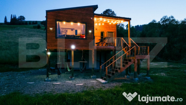 Construcție din lemn, tablă tip click și lambriu, complet mobilată și echipată, gândită pentru locuire permanentă sau turism premium.