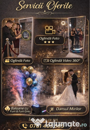 Oglinda foto și Platforma 360° video booth este o opțiune minunată pentru nunți și alte evenimente speciale. Pozele au un design elegant și pot fi personalizate în funcție de preferințele dvs., inclusiv cu logo-ul sau textul evenimentului dvs.