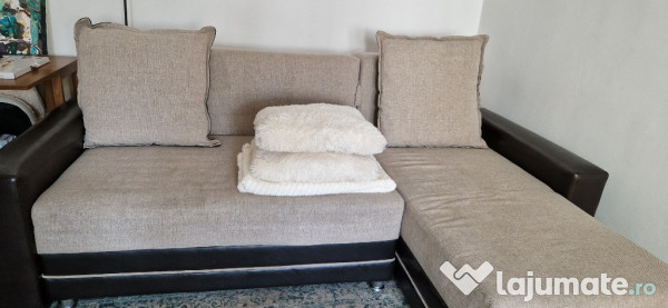 Vand coltar de sufragerie, dimensiune 230×160 deschis, 2 lazi de depozitare curate, tesatura bej cu inlocuitor din piele maro inchis in buna stare(fara rupturi sau pete majore, intretinut corespunzator), a stat in camera de nefumatori, are 4 perne originale. CADOU: 2 PERNE+PATURICA BEJ. Nu asigur transport.